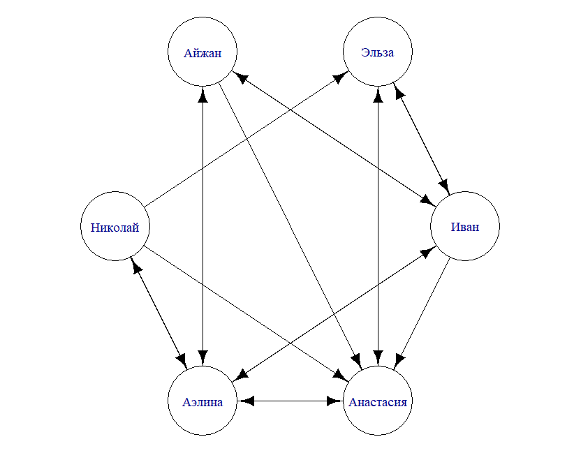 V(g)$label = c("Иван", "Эльза", "Айжан", "Николай", "Аэлина", "Анастасия")