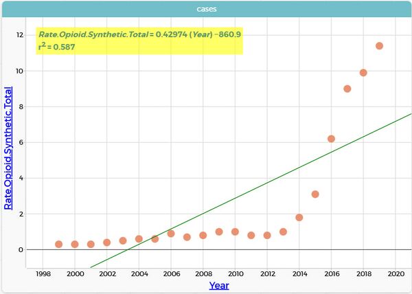 LSRL: Rate.Opioid.Synthetic.Total = 0,4297 (Year) - NaN N = 21, ρ = 0,7664, r2 = 0,5874