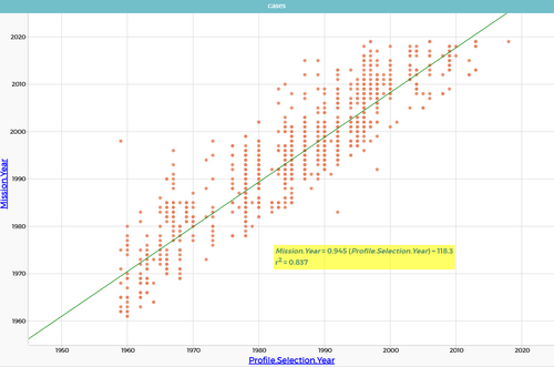 LSRL: Mission.Year = 0,945 (Profile.Selection.Year) + 118,3 N = [количество наблюдений], ρ = 0,915, r2 = 0,837