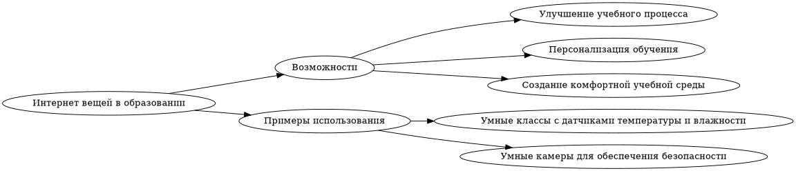 | Вывод: Внедрение IoT в образование открывает новые горизонты для улучшения качества и доступности обучения. Это не только делает образовательный процесс более эффективным, но и создает комфортную и безопасную среду для учащихся и преподавателей. |