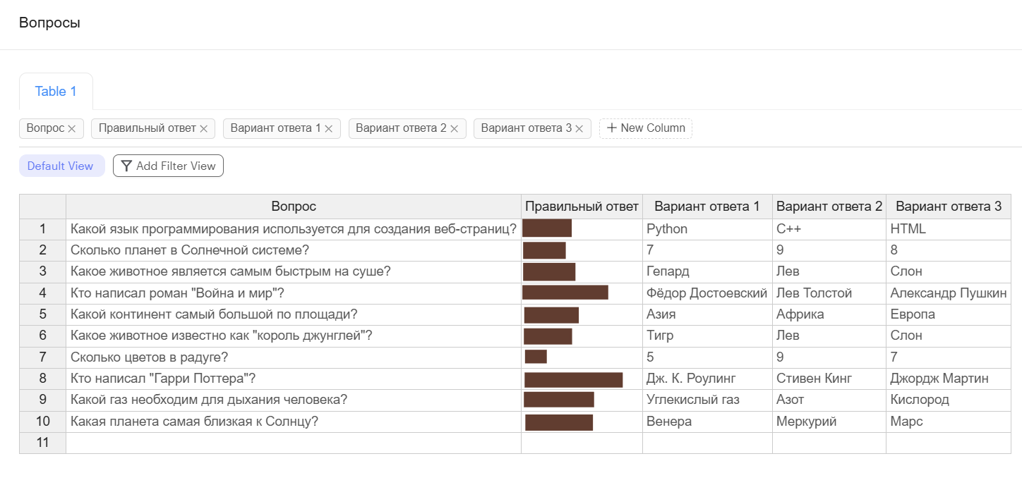 База данных в таблице