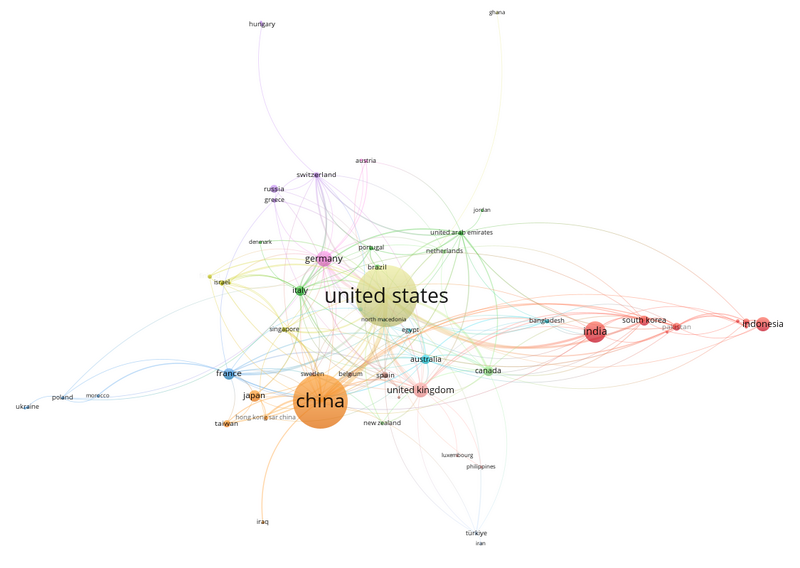 Граф, представляющий количество публикаций на тему безопасности в ОС Linux по странам (США и Китай лидируют)