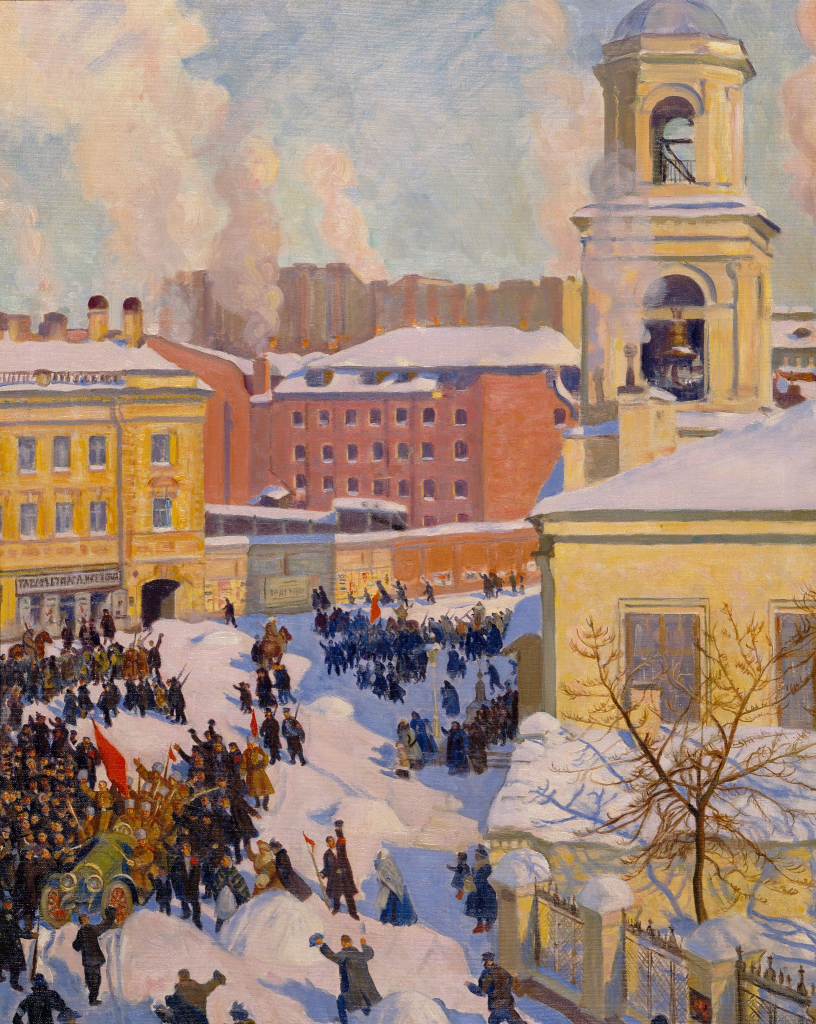Для Бориса Кустодиева, выдающегося русского художника начала ХХ века, известного своими знаменитыми изображениями дородных купчих и красочных народных праздников, «27 февраля 1917 года» – первый и единственный опыт своего рода документального пейзажа. Эта картина – уникальное живописное свидетельство происходившего тогда на улицах столицы. Из-за болезни художник был прикован к инвалидному креслу и только из окна мог наблюдать разворачивающиеся революционные события. Именно с этого ракурса и написана картина «27 февраля 1917 года». Художник восторженно встретил Февральскую революцию и сетовал лишь на невозможность быть в центре событий: «Здесь все кипит, улицы полны народом… никогда так не сетовал на свою жизнь, которая не позволяет мне выйти на улицу, – ведь „такой“ улицы надо столетиями дожидаться!»