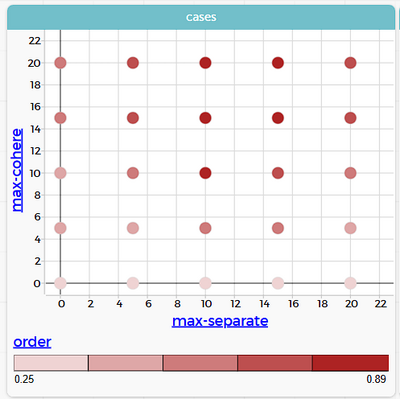 Исследовать, как соотношение между силой сплоченности (max-cohere-turn) и силой разделения (max-separate-turn) влияет на характеристики самоорганизации стаи: | |||