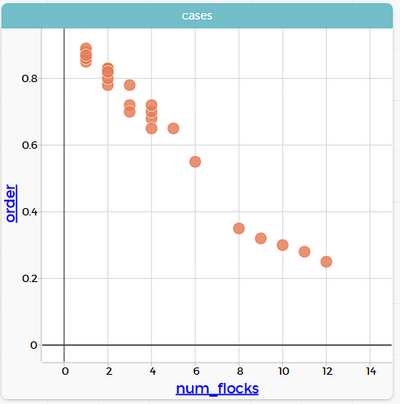 правило «разделение» (max-separate-turn) является стабилизирующим фактором, предотвращающим столкновения и удерживающим агентов на дистанции друг от друга. Правило «сплоченность» (max-cohere-turn) — объединяющим фактором, притягивающим агентов в одну группу.Если сила сплоченности значительно превышает силу разделения, агенты сбиваются в плотную, но потенциально нестабильную кучу с частыми «толчками». Если разделение слишком сильно, стая не сможет сформироваться и распадется на одиночек или пары. | |||