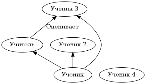 Учитель -> "Ученик 3" [label="Оценивает"] | Учитель -> "Ученик 3" [label="Оценивает"] ; | ||