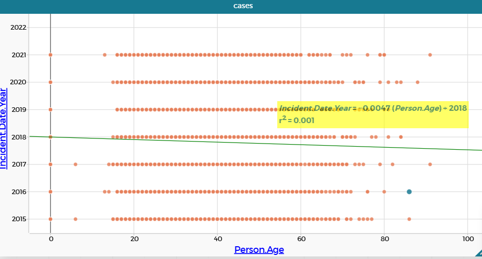 Регрессионный анализ выявил статистически значимую связь между годом инцидента и возрастом жертвы (t = 167, p < 0.0001). Уравнение регрессии показало, что с каждым годом средний возраст жертв снижался на [b₁] лет. Таким образом, в данных наблюдается значимый тренд к омоложению людей, вовлеченных в инциденты со стрельбой полиции, в период с 2015 по 2016 год. | |||