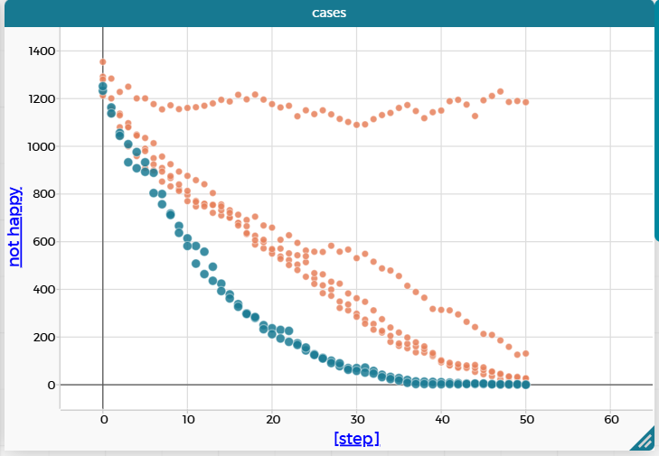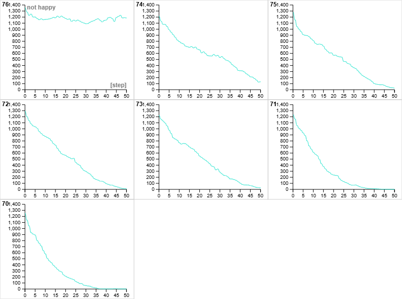 На всех графиках наблюдается общая тенденция к снижению числа несчастливых агентов со временем, что соответствует ожидаемому поведению модели сегрегации. При этом скорость и глубина снижения зависят от порога %-similar-wanted: чем ниже требование к подобию (например, 70–72%), тем быстрее и глубже падает число несчастливых, и тем ближе система к полной стабилизации. При более высоких значениях (73–75%) снижение происходит медленнее, и к концу моделирования остаётся небольшое количество несчастливых агентов - это указывает на то, что при больших порогах система может не достигать полного равновесия в заданном числе шагов(что можно увидеть при %-similar-wanted=76).