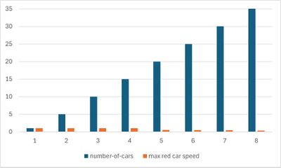 В ходе эксперимента с моделью Traffic Basic измерялась максимальная скорость красного автомобиля при различном количестве машин на дороге. До порогового значения плотности (примерно 15–20 автомобилей) максимальная скорость сохраняется на уровне 1, что соответствует свободному движению. После превышения этого порога наблюдается резкое снижение скорости, что свидетельствует об эмерджентном формировании дорожной пробки.