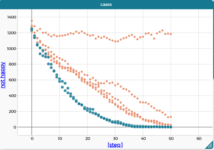 На всех графиках наблюдается общая тенденция к снижению числа несчастливых агентов со временем, что соответствует ожидаемому поведению модели сегрегации. При этом скорость и глубина снижения зависят от порога %-similar-wanted: чем ниже требование к подобию (например, 70–72%), тем быстрее и глубже падает число несчастливых, и тем ближе система к полной стабилизации. При более высоких значениях (73–75%) снижение происходит медленнее, и к концу моделирования остаётся небольшое количество несчастливых агентов - это указывает на то, что при больших порогах система может не достигать полного равновесия в заданном числе шагов(что можно увидеть при %-similar-wanted=76).