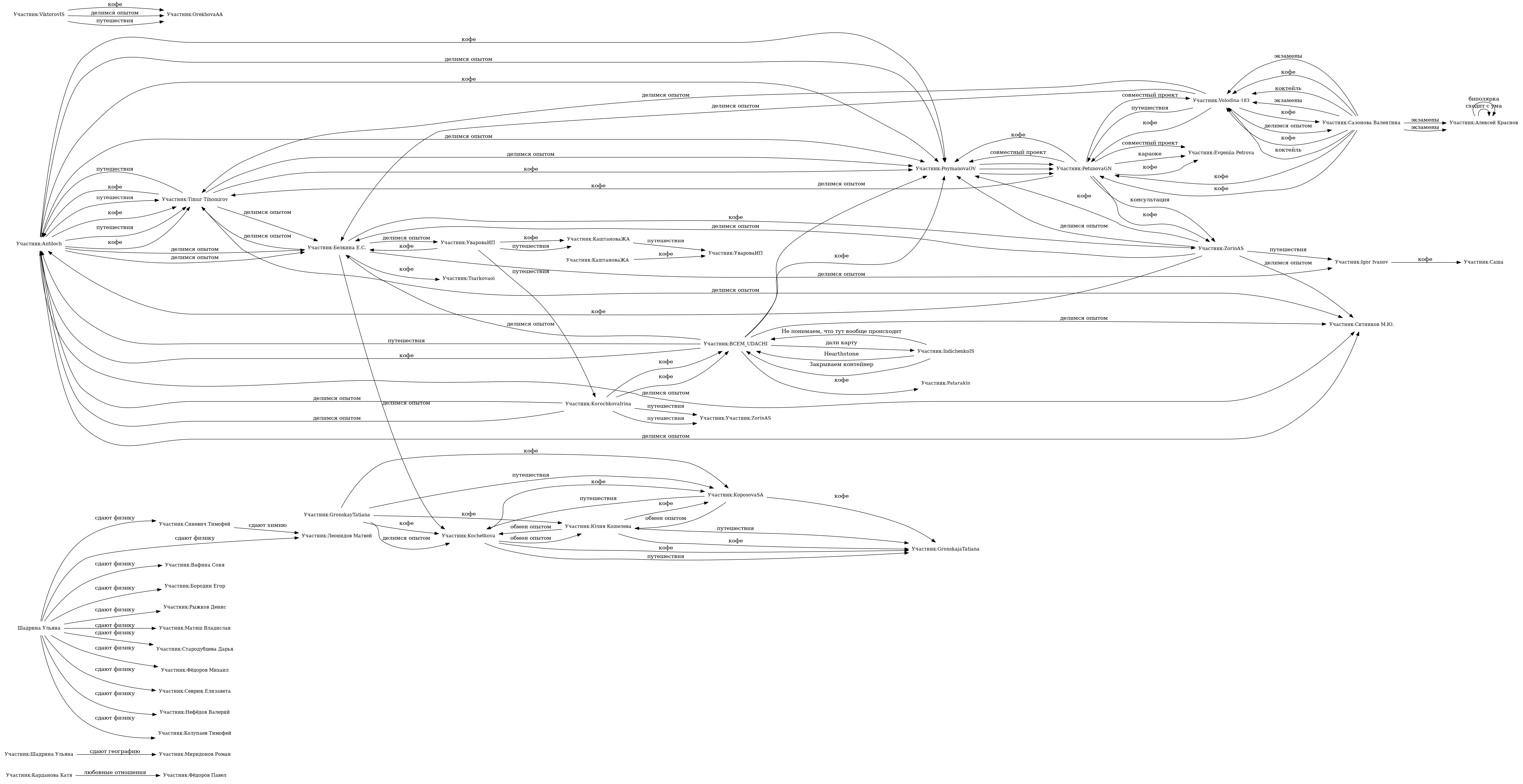 "Участник:Antiloch" -> "Участник:Timur Tihomirov" [label = "путешествия"]; | "Участник:Antiloch" -> "Участник:Timur Tihomirov" [label = "путешествия"]; | ||