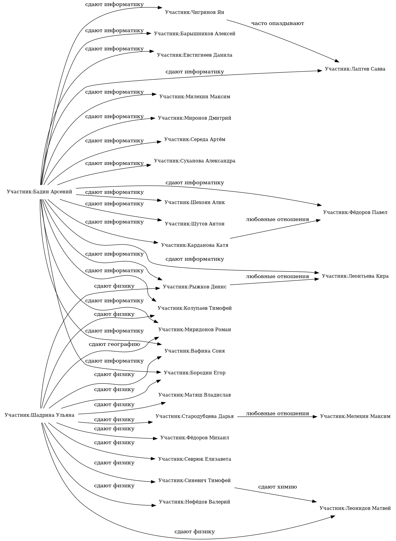 "Участник:Бадин Арсений" -> "Участник:Шутов Антон" [label = "сдают информатику"]; | "Участник:Бадин Арсений" -> "Участник:Шутов Антон" [label = "сдают информатику"]; | ||