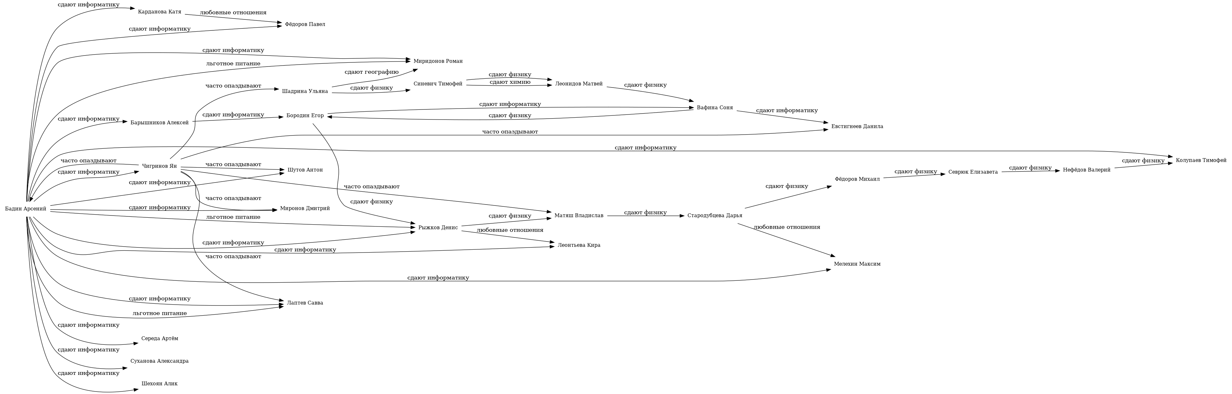 "Бадин Арсений" -> "Карданова Катя" [label = "сдают информатику"]; | "Бадин Арсений" -> "Карданова Катя" [label = "сдают информатику"]; | ||