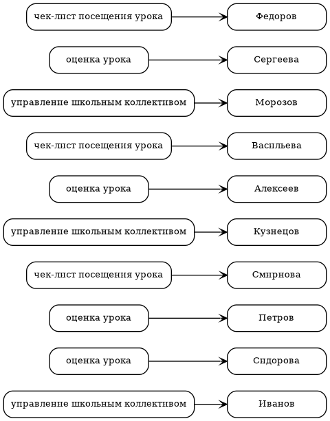 Этот код для GraphViz создаст направленный граф (орграф), в котором вершины представляют учителей московской школы, а направленные рёбра показывают связи между ними по заданным темам ("оценка урока", "чек-лист посещения урока", "управление школьным коллективом"). Анализ графа