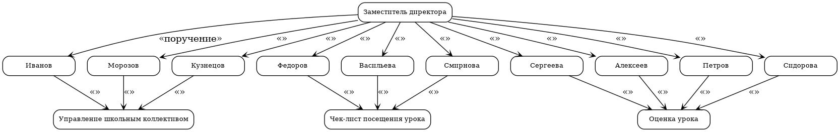 "Заместитель директора" -> "Иванов" [label= | "Заместитель директора" -> "Иванов" [label=«поручение»]; | ||
