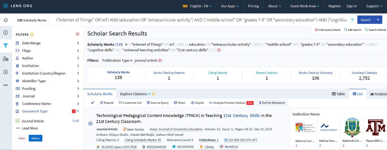 '''Библиометрическое исследование по запросу''' ''("Internet of Things" OR IoT ) AND ( | '''Библиометрическое исследование по запросу''' ''("Internet of Things" OR "IoT") AND ("Education" or "Studying" or "Pedagogic" or "learning" OR "teaching" OR "schooling") AND (("grades" OR "grade") AND ("7" OR "8" OR "9"))'' | ||
