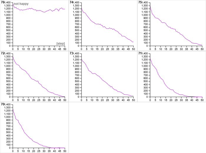 На всех графиках наблюдается общая тенденция к снижению числа несчастливых агентов со временем, что соответствует ожидаемому поведению модели сегрегации. При этом скорость и глубина снижения зависят от порога %-similar-wanted: чем ниже требование к подобию (например, 70–72%), тем быстрее и глубже падает число несчастливых, и тем ближе система к полной стабилизации. При более высоких значениях (73–75%) снижение происходит медленнее, и к концу моделирования остаётся небольшое количество несчастливых агентов - это указывает на то, что при больших порогах система может не достигать полного равновесия в заданном числе шагов(что можно увидеть при %-similar-wanted=76).
