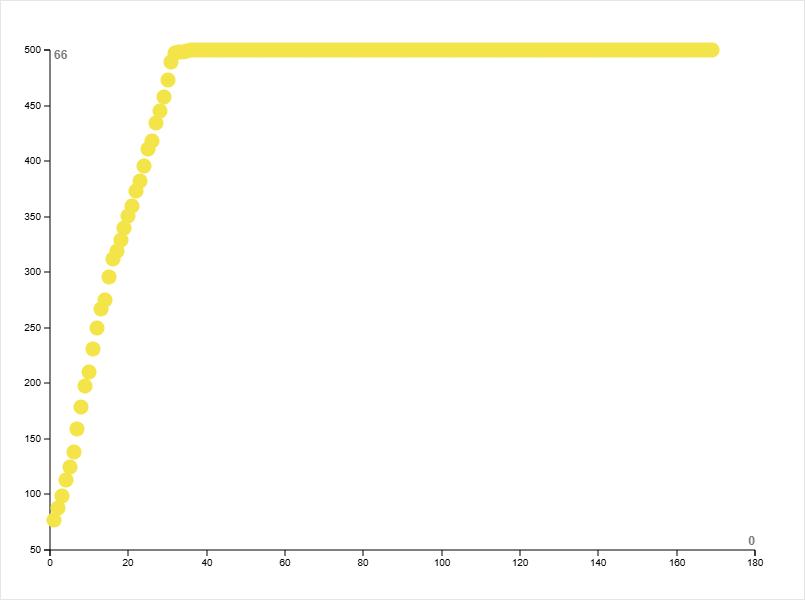 После третьего процесса стало понятно, что чем меньше вероятность бабочек попасть в клетку выше — тем чаще они будут слетать вниз, поэтому число всех бабочек будет непостоянно. Время же, понадобившееся для первого момента, когда все 500 бабочек были на высочайших точках, стало равно 300 тикам, что в 5 раз больше, чем при 65% вероятности. Это свидетельствует о том, что пересечение вероятностей, где бабочки пересекаются на высоких точках, достигается всё сложнее. Тем не менее, этот вариант точнее всего законы природы — не всегда всё будет в равновесии.