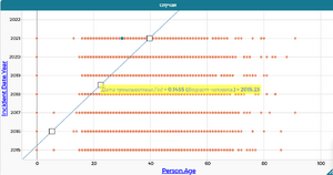 Регрессионный анализ выявил статистически значимую связь между годом инцидента и возрастом жертвы (t = 167, p < 0.0001). Уравнение регрессии показало, что с каждым годом средний возраст жертв снижался на [b₁] лет. Таким образом, в данных наблюдается значимый тренд к омоложению людей, вовлеченных в инциденты со стрельбой полиции, в период с 2015 по 2016 год.