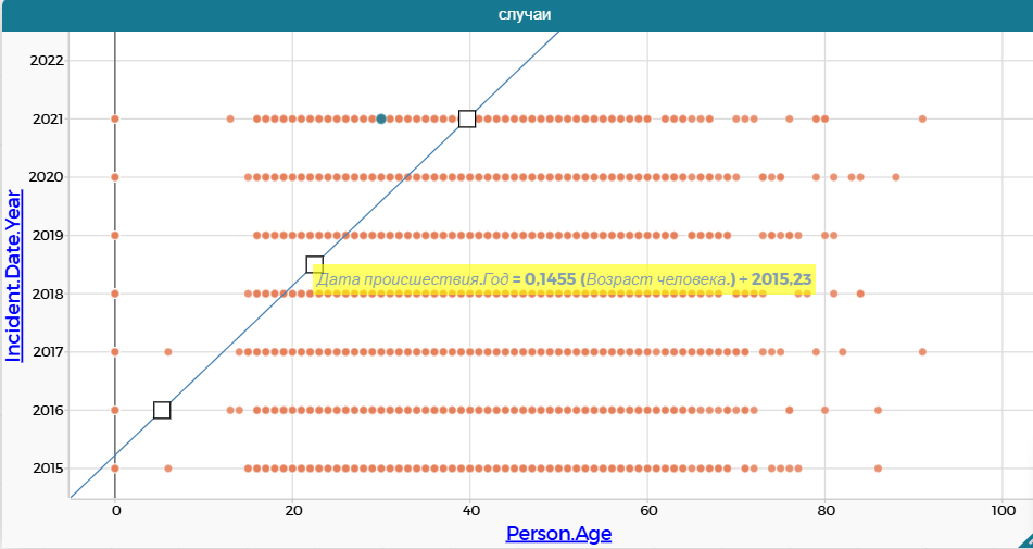 Регрессионный анализ выявил статистически значимую связь между годом инцидента и возрастом жертвы (t = 167, p < 0.0001). Уравнение регрессии показало, что с каждым годом средний возраст жертв снижался на [b₁] лет. Таким образом, в данных наблюдается значимый тренд к омоложению людей, вовлеченных в инциденты со стрельбой полиции, в период с 2015 по 2016 год.