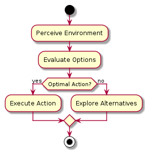 Версия от 14:41, 1 мая 2024; Patarakin (обсуждение | вклад) (Новая страница: «<uml> @startuml start :Perceive Environment; :Evaluate Options; if (Optimal Action?) then (yes) :Execute Action; else (no) :Explore Alternatives; endif stop @enduml </uml>»)