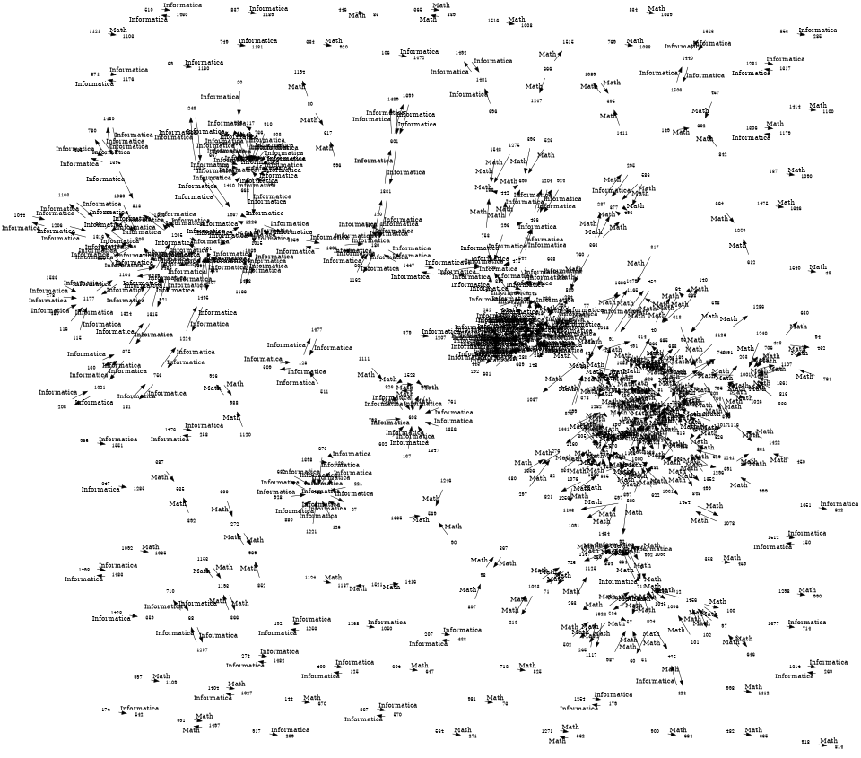 Версия от 20:52, 22 марта 2023; Patarakin (обсуждение | вклад) (Новая страница: «<graphviz> digraph G2 { layout = "neato"; node [fontsize="9", shape="none", style=""] ; // edge [arrowhead=normal, arrowsize=0.4, len=1.2]; size="10,10" ; 926 -> 988 [ label = "Math" ] 988 -> 926 [ label = "Math" ] 316 -> 137 [ label = "Math" ] 835 -> 1000 [ label = "Math" ] 979 -> 1207[label = "Informatica" ] 597 -> 1091 [ label = "Math" ] 764 -> 1001 [ label = "Math" ] 816 -> 1001 [ label = "Math" ] 309 -> 1001 [ label = "Math" ] 1466 -> 1001 [...»)