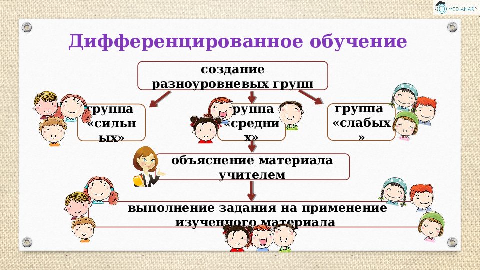 | Важные для технологии понятия (если есть) | Дифференцированное обучение, Дифференциация обучения (дифференцированный подход в обучении), Принцип дифференциации обучения, Индивидуальное обучение |