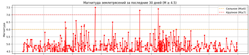 axes[0].set_title(f'Магнитуда землетрясений за последние 30 дней (M ≥ 4.5)')
